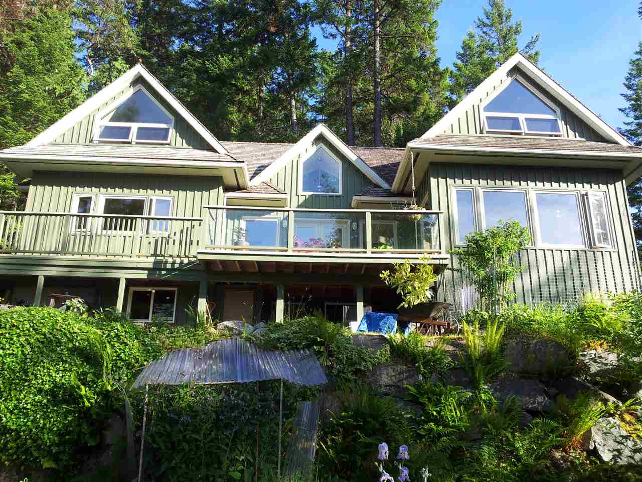 Natures Hideaway at this lovely 2 level, 2 bdrm, 2 bath OCEAN VIEW home located on very private 1/3 acre, backing onto Crown land and fully landscaped with beautiful shrubbery, ferns, & lovely pond for tranquil moments. The home has unique, triangular shaped wood trimmed windows that look out to Garden Bay plus a wrap around deck from the nook to the side of kitchen. The home has a wonderful feel, with a studio area upstairs for an artist, plus 2 very uniquely shaped bedrooms. The main floor enjoys a very comfortable living room, kitchen, with wood burning stove in dining area, plus foyer, & many storage areas. The lower level has a walkout workshop area below the main level. The 2 bathrooms have been updated with Nuheat on main floor. New w/d, fridge, hot water tank 2016.