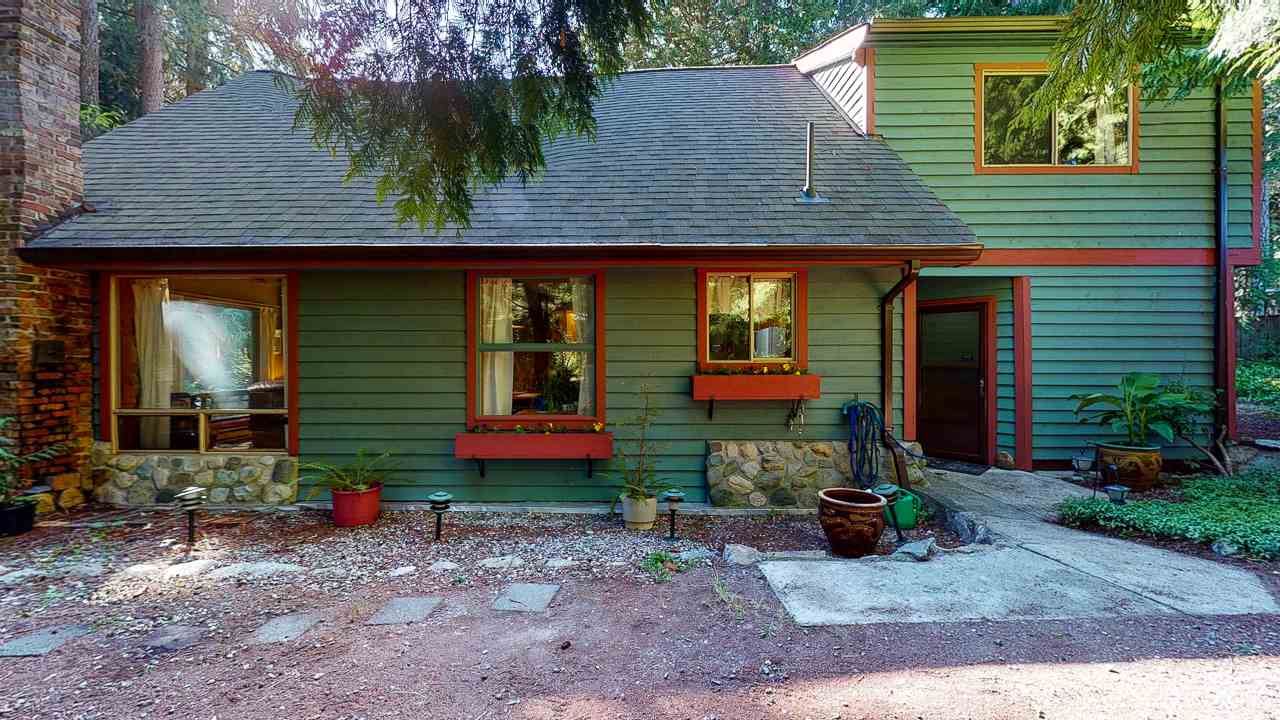 It feels bit magical to come down the driveway & see this lovely home nestled in mature trees. Discover this charming 2 Br & Loft or 3 BR chalet-style home in the heart of Halfmoon Bay on a private, treed .4 acre lot. Main flr incls open-concept kitchen w/knotty pine cabinets & lrg island that opens to spacious dining/living area featuring soaring 19’ vaulted ceilings, cast iron stove in blue enamel set into river stone surround. Unique stair-rail fashioned from pine reclaimed from the property. Upstairs: Lrg loft & master bdrm w/clawfoot bathtub in ensuite. Playhouse nestled in the trees or use as a craft cottage. Fantastic location: 1 blk to transit, 3 blks to elementary school & local grocer. 5 min drive to launch your kayaks at Sargent Bay or Coopers Green.