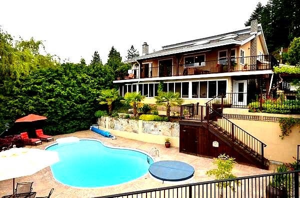 5635 - 5641 RUTHERFORD. Desirable sheltered bay waterfront featuring 3300 sq ft split level home, 6 bedrooms, 4 bathrooms, boasts vaulted ceilings, skylights, rock fireplace, big island kitchen, large decks and patios to enjoy waterfront living, and entertaining. Located at end of quiet cul-de-sac, this home and property has a vacation home feel. Palm trees, waterfront, beach, in-ground pool,, detached shop/boathouse with 1 bedroom suite above, lots of deck space. Municipal water, septic, open parking, paved driveway, stamped concrete patio around pool. Some TLC to property and home required.