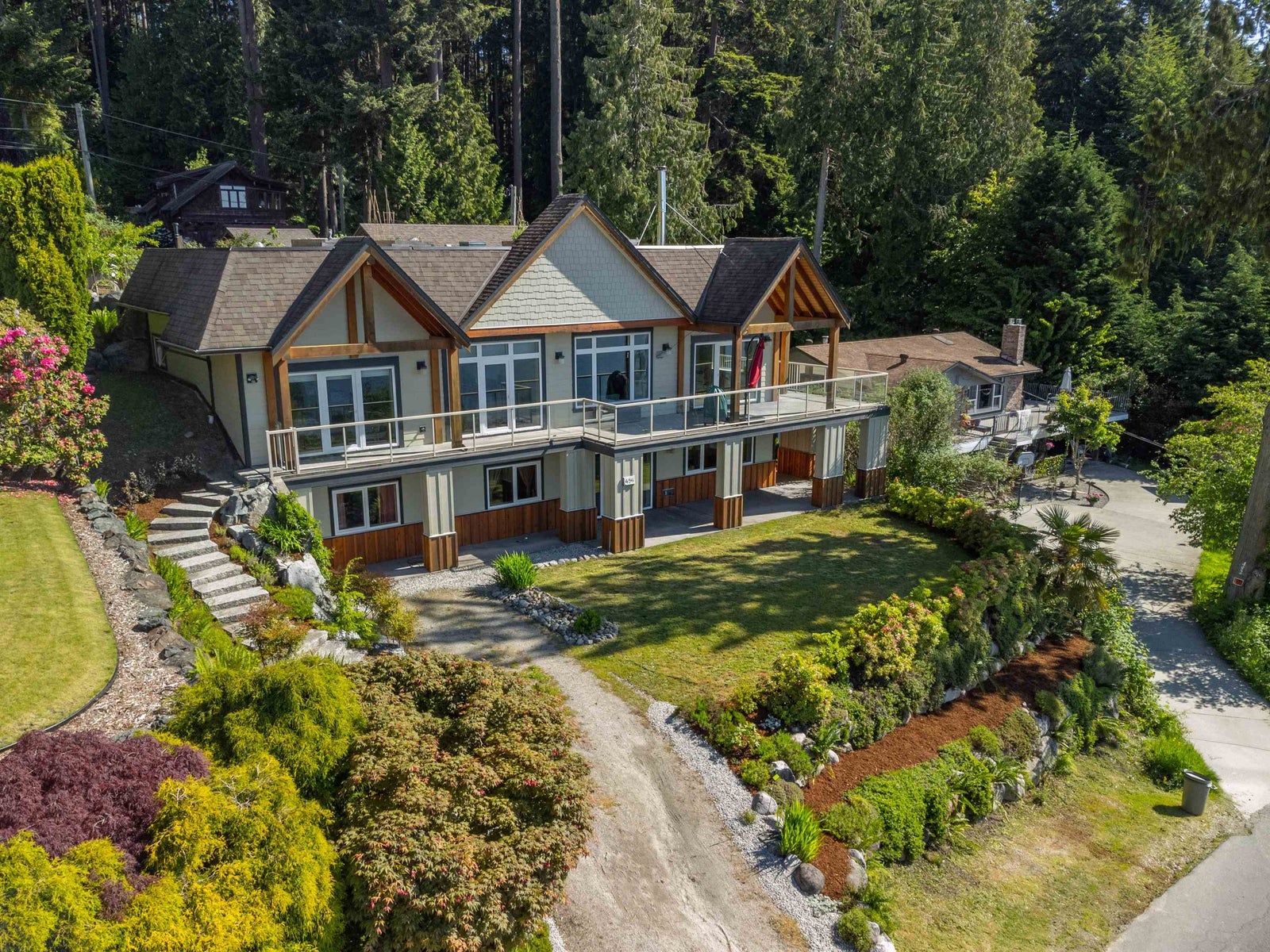 Gorgeous reinforced concrete ocean view home with huge suite in sought after Grantham's Landing! Unmatched location & construction featuring radiant in-floor heat throughout, Euroline windows, HVAC, huge custom kitchen, SS appliances, soaring domed ceiling in living/dining room, floor to ceiling stone wood burning fireplace, wrap around decks, level front yard, dbl garage, carport, EV charger & astounding green roof w/fruit trees & raised veggie beds. Main level offers spacious bedroom suite + den. Ground level provides a bright 2 bed, 2 bath suite w/full kitchen & laundry for fantastic income potential. Ideal home for investors, families who enjoy privacy or anyone who loves to entertain. One of a kind showpiece built to be enjoyed for decades to come. Grantham's Wharf access for $50/yr.