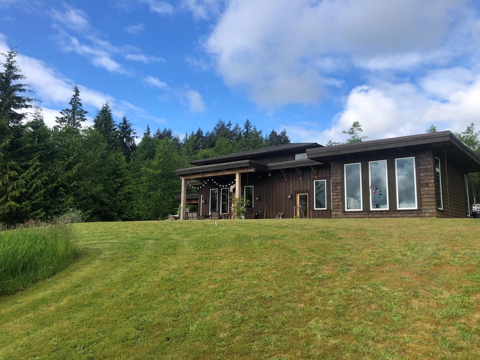 Beautifully designed, this sensational post and beam custom home exudes elegance & pride of ownership! Situated on 5+ ac with a gated drive, rolling lawns and forest paths all with complete privacy. 4 minutes from the Ferry. This home has creative & bright living spaces, including large gourmet kitchen, huge island & pantry. The dining area easily accommodates the custom-designed 9 ft. table for entertaining family & friends. Master bedroom with a private balcony & deluxe ensuite. You will appreciate the uniquely finished concrete floors with in-floor heating (so easy to maintain), re-claimed old-growth fir flooring, vaulted ceilings, brick wood-burning fireplace, media room, fully equipped guest studio/ suite, goldfish pond, 8 ft. high windows with views of mountain peaks and more.