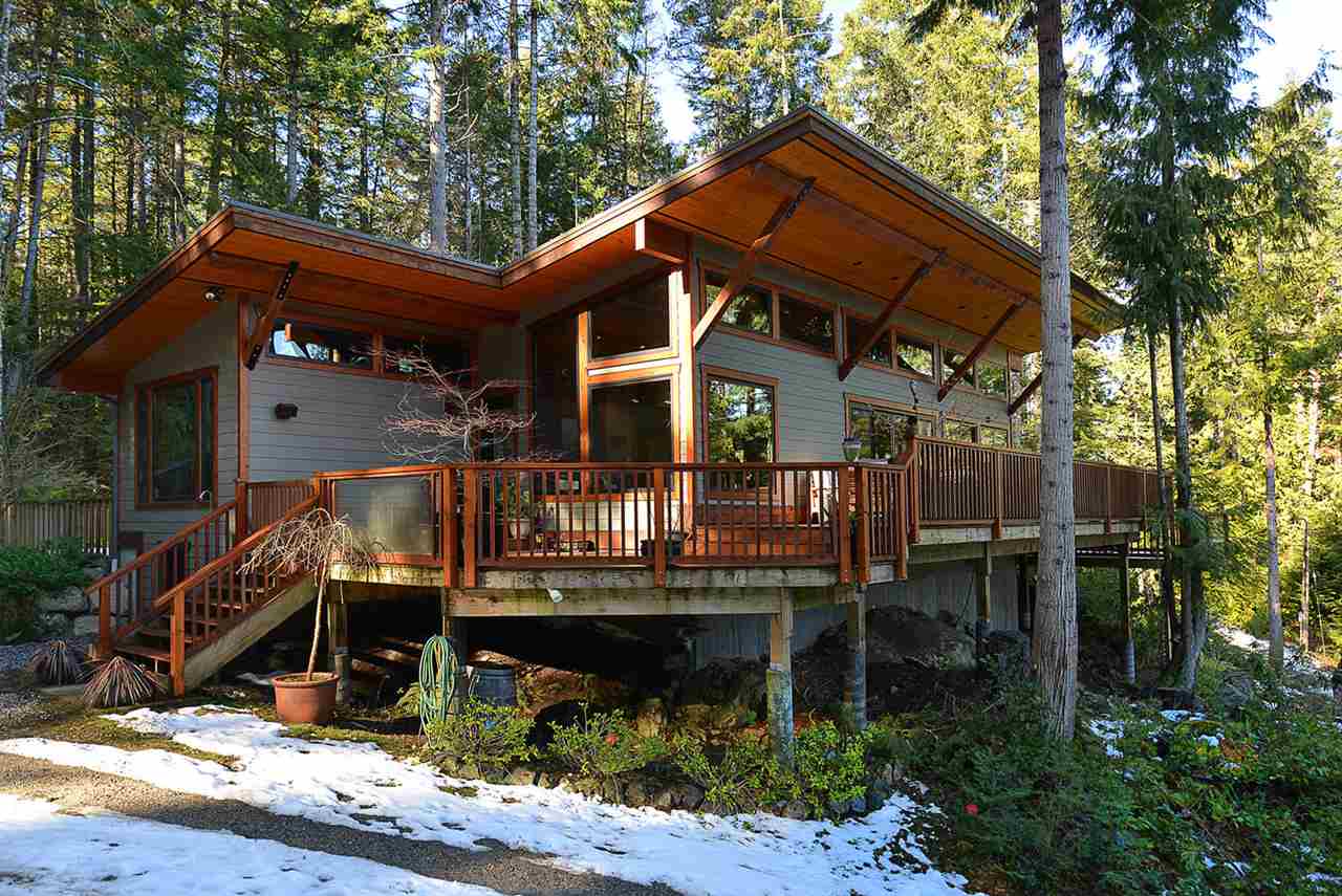 Expertly constructed, one of a kind West Coast contemporary Rancher situated on nearly one acre of lush forest. The open floor plan features vaulted ceilings, radiant heated concrete floors, a beautiful gourmet kitchen with granite counters & new s/s appliances, skylights, hot water on demand & HRV. Outside you'll find huge wrap around decks, natural gardens, a 2 car garage & a separate room that could be a sleeping cottage for guests. Total privacy is ensured as the property backs on to Smuggler's Cove Provincial Park, with a trail leading in directly from the property. Low maintenance inside & out, and move in ready. One of the Coast's best locations within walking distance to the ocean, marinas and more.