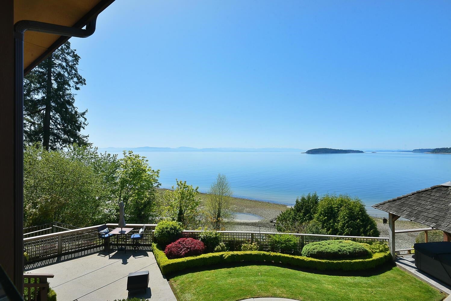 Sun-drenched, stunning waterfront home & property w/ spectacular views & sunsets! 3,599 sq.ft w/ 3 attached suites. West facing w/over 1/2 acre & 83' of oceanfront, beautifully landscaped w/irrigated low maintenance gardens. The level entry open concept main level features a gourmet kitchen, master bdrm w/spa-like ensuite, guest bedroom & a spacious patio, while upstairs is a self contained bedroom suite w/ocean views as far as the eye can see. The ground level features 2 more luxurious self contained suites w/stunning ocean views & 2 hot tubs. At the water's edge there is a beach spa cottage, infrared sauna & a pergola - enjoy the sound of waves gently crashing upon the shore! Operating as a highly successful vacation rental- generate excellent income, enjoy w/ family & friends, or both!