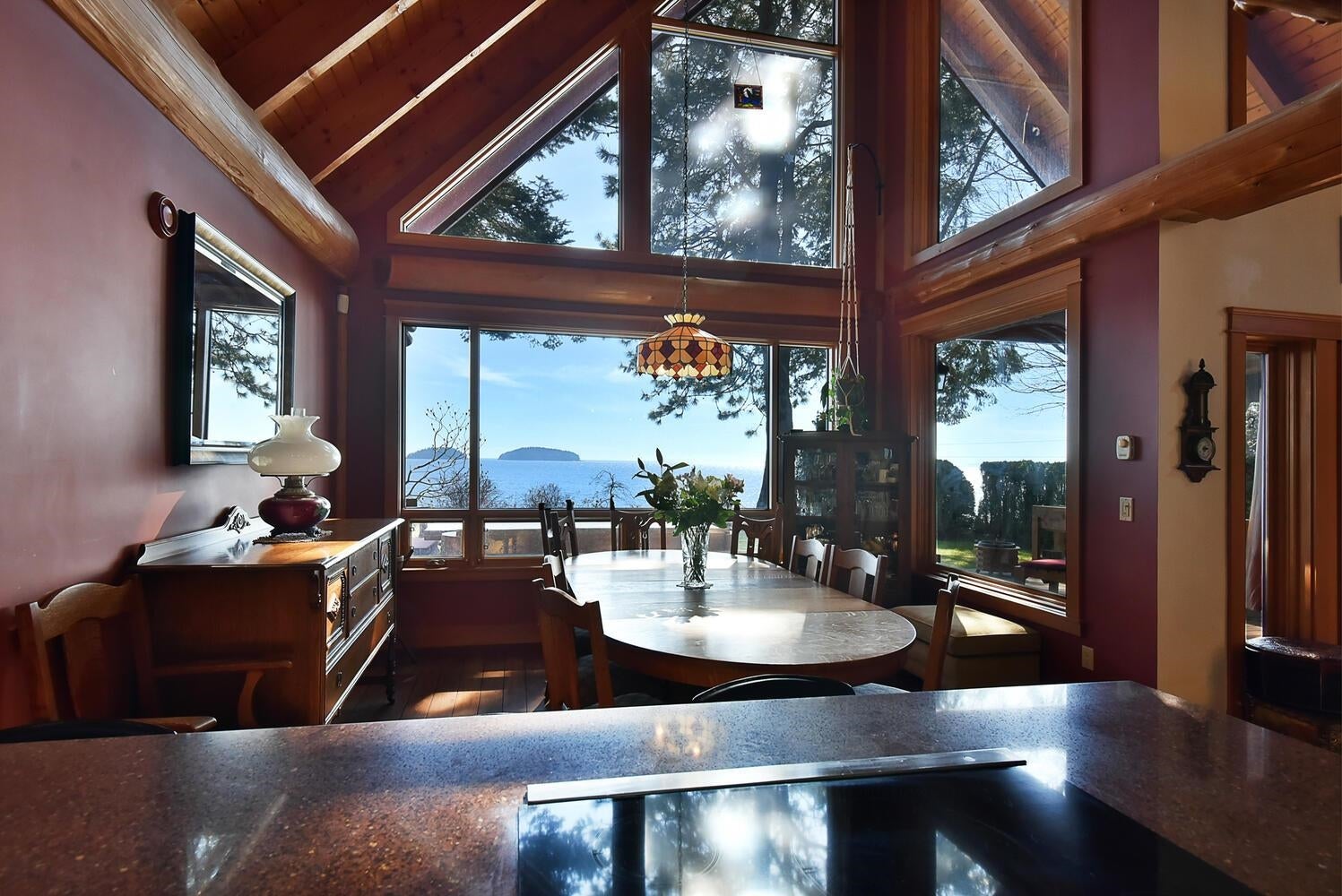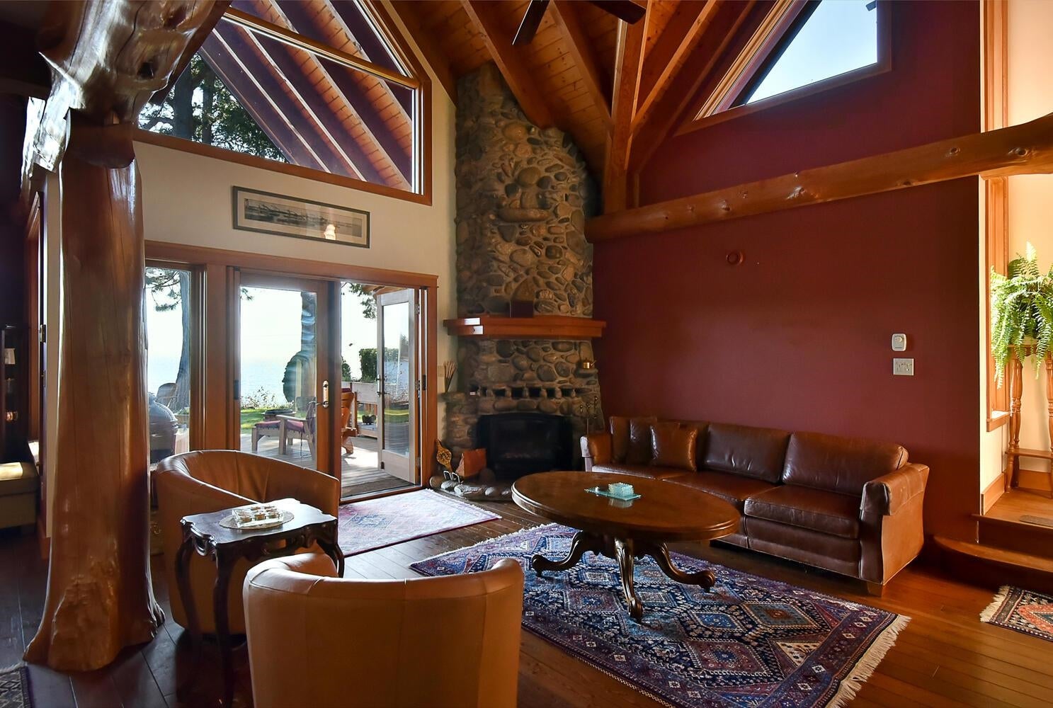 Prestigious FRANKLIN ROAD WATERFRONT, walking distance to the pristine beach below as well as all of the amenities in Lower Gibsons incl. restaurants, shops & the Public Market. This immaculate, custom built home features soaring vaulted ceilings & impressive beam work, all meticulously built & immaculately maintained. Open plan main floor features kitchen/living/dining as well as a den/bedroom, the top floor is a spectacular primary bedroom w/ luxurious ensuite & sitting area, and the basement level could be more bedrooms/ hobby rooms. Stunning ocean views front & centre from all main living spaces, cozy wood burning fireplace, radiant in floor heat, H/W floors. The level property features mature landscaping & lovely gardens. You can't beat this highly sought after, quiet location.